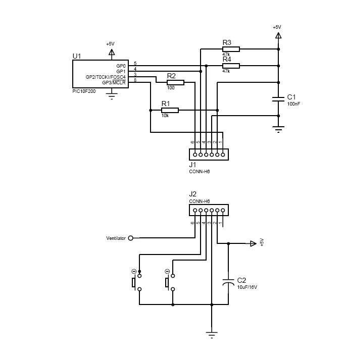 Megrajzoltam. A rajz a DIP8 tokozású kontrollerhez készült. A lábak funkciójának megtartásával átrajzolható a SOT23-6 tokosra is. A programozáskor használt két kivezetés lett a két nyomógomb bemenete, a harmadik bemenet a MCLR (reset), de lehet más bemeneti funkciót is adni neki. Gyakorlatilag a programozó adapteren megoldható a kapcsolás. 10F200 adatlap A rajzon a J1 csatlakozó a programozó (pl. PICKit2) csatlakozója is egyben. A J2 pedig már a felhasználás. A GP0 kivezetésen levő ellenállás a kimenetet védi. Ide csatlakoztatható a tranzisztor / FET / optocsatoló / stb. Közvetlenül csak kis fogyasztású relé védődiódával. Nagyobb fogyasztásúhoz egy meghajtó tarnzisztort ajánlok.