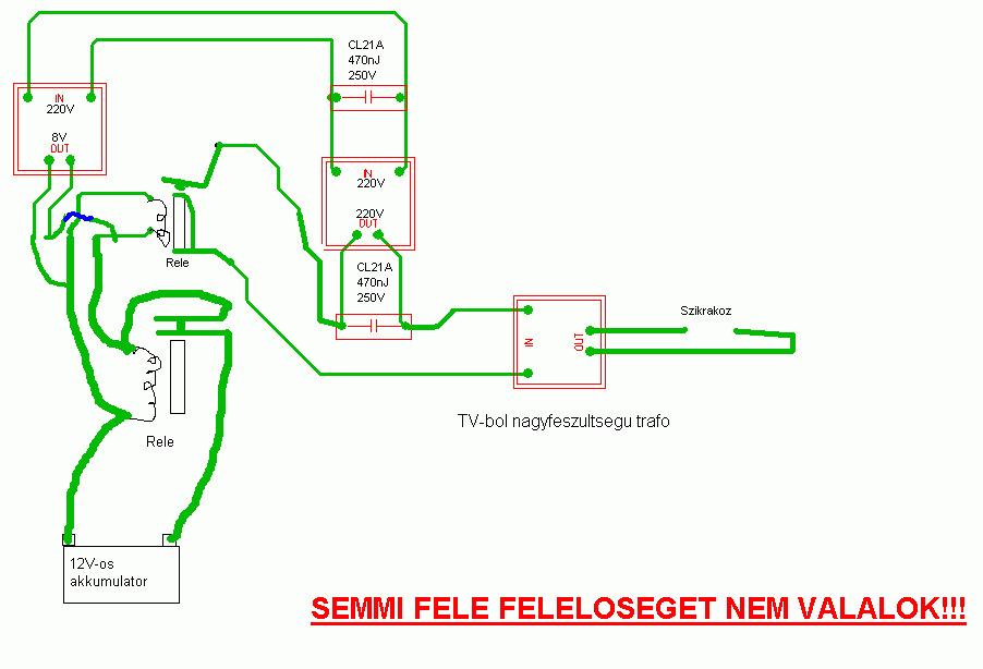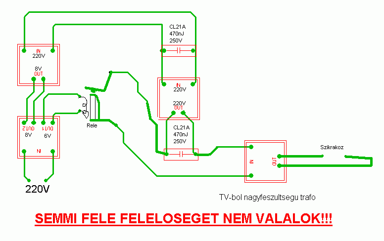 Itt egy nagy fesz generator tevrajza... Ha az elso trafot kiszeded es impulzusokba,mondjuk egy csengo aramkorhoz hasonloan egy relevel megoldod ugy jo,de nagyon veszelyes(ha tapizzak a kimenetet) (Ha igaz amit az azonositodba irtal,13eves,akkor en egykoru vagyok veled es egy nap alatt kesz) ha szepen megkersz megmutatom a 12V-os bekotest