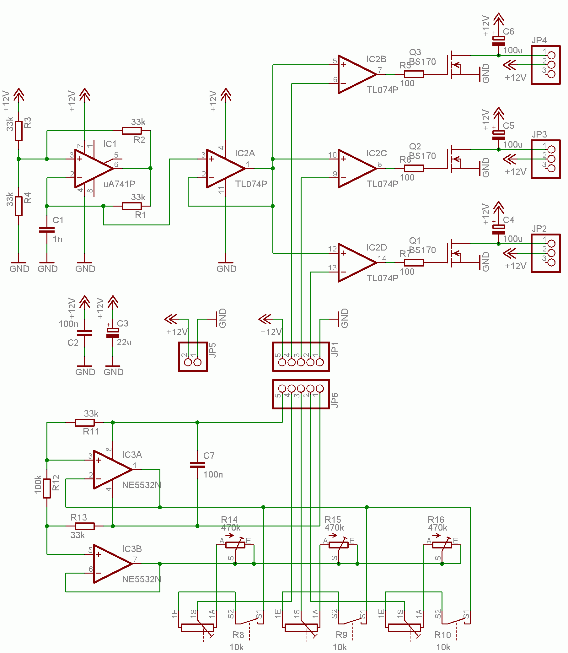 A dolgot úgy képzeltem, hogy a 2. OPA kimenetére jönne még 3 OPA invertáló bemenete, a nem invertálókra meg potméterek középleágazását raknám. A potméterek végei 2/3, és 2/5 feszültségen lennének, így félfordulat alá lehetne menni. A potméterek tápfeszültség felé néző ágaiba meg kapcsolót raknék, mert így OPA bemenetét lehúzhatom 0V-ra, és megáll a venti. Jó így az elgondolásom?