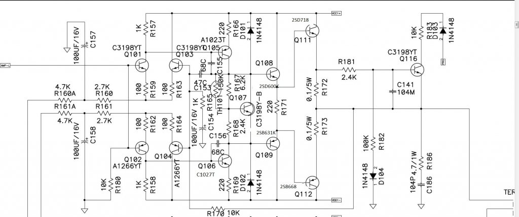 Találam egy hasonló kapcsolási rajzot. Ami nincs az erősítőben az a D101-D102 és a TH101. Ezeken kivül elég nagy a hasonlóság. Ez egy Magnat BullPower 4600 kapcsolási rajzának az egyik csatornája.