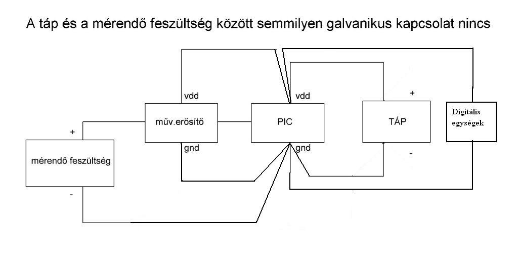 Az összes analóg rész (több csatorna is lehet) tápja és földje az analóg Vdd és Vss csillagpontokra megy. Az összes digitális egység (különösen a (multiplexált) LED kijelzők) tápja és földje a digitális Vdd ill. Vss csillagpontra megy. Mindkettő a pic közvetlen közelében van. Az analóg Vss és a digitális Vss között egy és csak egy vezeték van. A digitális csillagpontra megy a táp az analóghoz lehető legközelebb levő részre. Ugyan így kell megoldani az analóg és digitális Vdd összekötését.