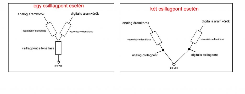 Ha egyetlen föld csillagpont van, akkor a felülethez való kötés megvalósításából már keletkezhetnek hibafeszültségek. Pl. a pic digitális kimeneteinek árama már az analóg földpontok hozzávezetése után csatlakozik a földpontra. Egy 40 lábú tok 35 digitális kimenete darabonként 25 mA árammal már 875 mA -es áram ugrást produkál, ha mindet egszerre kapcsoljuk ki vagy be. Ez a 875 mA átfolyna azon a kis vezetéken, ami az egyetlen csillagpont és a pic Vss lába között van. Ha két föld csillagpont van, az összes analóg föld vezeték a pic Vss lábáról kapja a jelet. Nincs az analóg és a digitális csillagpontot összekötő vezetéken digitális jelből származó áram.