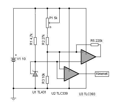 Szükségem lenne egy egyszerű áramkörre, ami figyeli egy 12V ólomakku feszültségét. Ha a feszültség leesik kb 10V körüli értékre, akkor pl. kapcsoljon egy ledet, vagy kapcsoljon egy kollektort földpotenciálra, stb stb... Egy kommunikátor lenne, amit vezérelne, és az akku állapotot kell jelenteni.