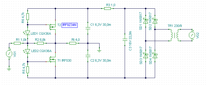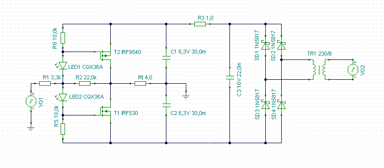 Pafi, meg lehet csinálni a mosfetest nagyobb teljesítményre is, nagyobb tápfesszel és kisebb R2-vel ? Ez valójában szimmetrikus táp, nem ? Csak szimpla trafóról megoldva. Én 2 szekunderrel csinálnám, kisebb kondikkal.