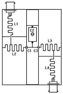Ez a kapcsolás azért nem ilyen egyszerű. Amik tekercsnek látszanak, azok egy elosztott paraméteres rezonátorok strip line technikával kivitelezve. Két soros, két párhuzamos rezonátor kombináció, ahol a kombinációk közötti csatolási tényezőt lehet állítani a C2 trimmerkondival. A csatolási tényező állításával a kívánt sávszélességet lehet beállítani