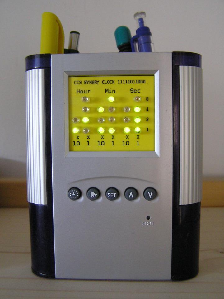 kész van a karácsony óta bedobozalatlan óra. Mert bizony mindíg a dobozolással van a probléma... Egyik nap aztán szert tettem egy tolltartós kvarcórára 200 Ft-ért. Kidobva a működőképes belsejét, végre lett hova raknom a bináris órát. Mivel a panelra raktam egy 5V-os stabilizátort is, így egy telefontöltő trafóval vígan elketyeg. A változtatás annyi az eredetihez képest, hogy 16F627A prociba égettem be a programot. Úgy éreztem memória pazarlás egy 628-as.