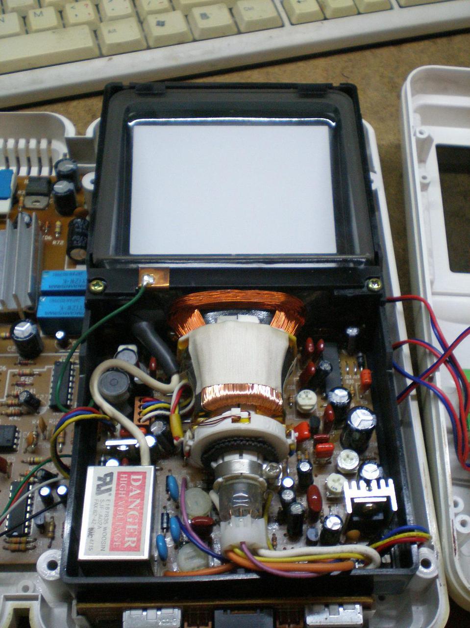 Pedig ugyanúgy működik, mint egy másfajta katódsugár cső. Annyi a különbség, hogy az elektronsugár által gerjesztett fénypor nem azon a négyszögletes üvegen van, amit látsz, hanem egy megfelelően görbített fém tükrön ami egyben az anód is. Ugyanúgy, ahogy egy varázsszemen is láthatod. A négyszögletes üveg, csak egy fényszűrő, ami még az alacsony felbontást is némileg korrigálja. Az a tény, hogy rendes fém anódja van, az anódfeszültség igényét is csökkenti.