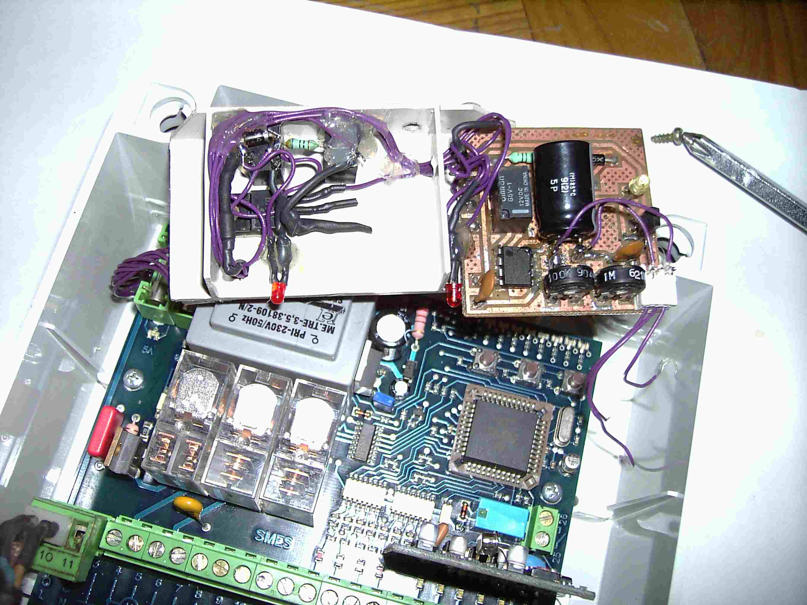 a képen jobról látható az időzítő rész, a baloldali áramkörnek az a feladata, hogy a vezérlés (nagy panel) működéséből megállapítsa mikor nyílik a kapu, mikor indítsa az időzítést, és mikor szakítsa meg (ez a része nehezebb volt).