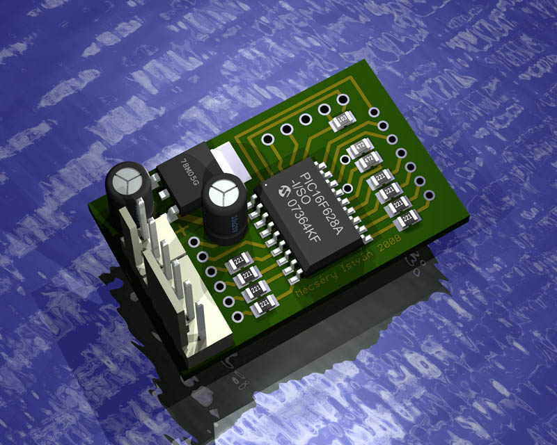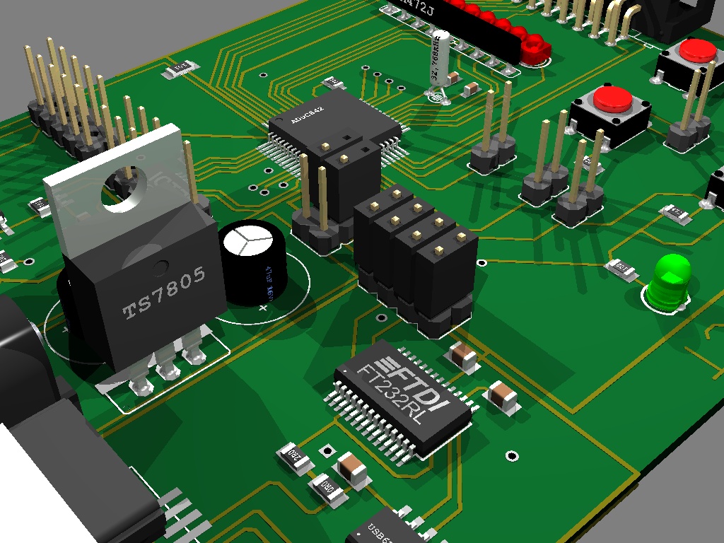 Több megoldatlan problémám is van povray-el..... azaz inkább kérdés nem probléma..... szóval: a mellékletben lévő áramkörön van a fesz.stab.... azt szeretném elérni, hogy az legyen ráirva hogy: TS7805 és alá másik sorba hogy 8A1 CZ.... na most ezt az istennek sem akarja megcsinálni. próbálkoztam azzal hogy a TO220 as tok makrojában van egy sor ami text méretét és pozicioját adja meg, ezt még egy példányba leásoltam és povraybe probáltam az első szöveg mellé irni valahyogy így ("TS7805","8A1 CZ") aztán persze ez nem jöt össze.... rájöttem hogy csak az ic nél van hogy elöbb megadom a tipust aztán a gyártó matricája jön.. na meg az lenne még a kérdésem hogyan lehet az alap 2 vagy 3 matricán kívül ujakat betenni..... a háttérben is látható ADuC842 re kéne egy Analog Devices -os matrica.....