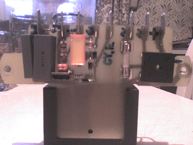 felteszem a már javitott kapcsolást is. Közben eszembe jutott, hogy jó lenne szétbontani a trafót, lenézni a menetszámokat, hogy reprodukálni lehessen. Persze jól össze van ragasztva!Pici a trafó, 15x14x5mm a mérete, 2db E magból áll. (szóval egy E mag magassága7 mm) Nem is tudom, lehetne-e ilyen kicsi magot, csévetestet beszerezni.