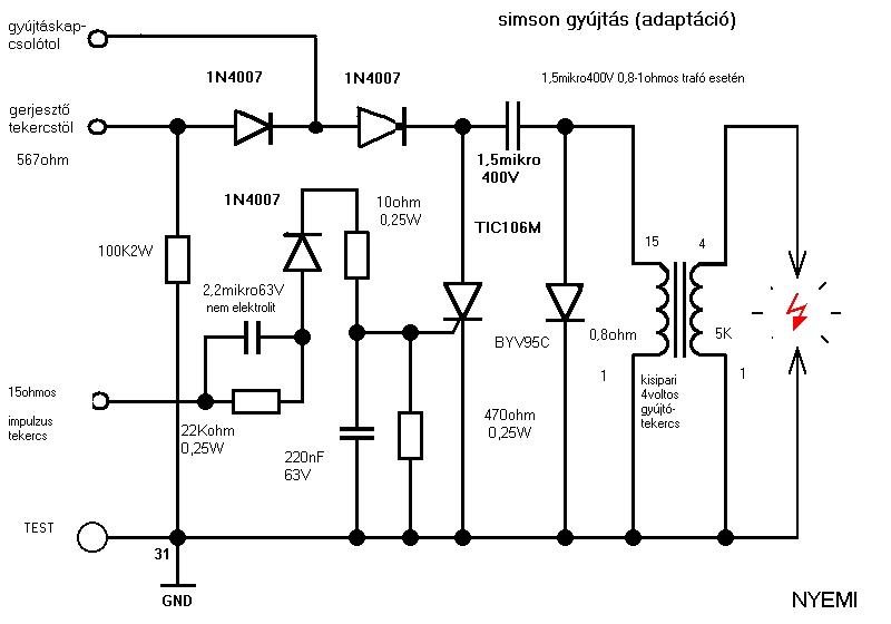 Szia Krisz03 igen a probléma létezik, igen elmászik a gyújtás a holtpont felé és nem a stroboszkóppal van a baj. Az oka az impulzus tekercs terhelés függő jel alak változásai és az áramkörben levő diódák nem lineáris ellenállás változásai,(szerintem) kiküszöbölni teljesen sajnos nem lehet csak csökkenteni. A stroboszkópra gondoltam én is eleibe, de amikor egy olyat készítettem, ami csak egy glim lámpából állt (sorosan bekötve a gyertya kábelbe) és ott is előjött akkor kezdem el gondolkodni. a kapcsolás, amit közöltél (nyemi fajta) az nem azzal az értékekkel üzemel most a Simsonomba pont, emiatt ezért most, leközlöm a mostani variációmat , igaz ez is váltózik egy kicsit, de nagyság rendekkel kevesebbet. De lehet, hogy ez nálad nem lesz jó (a lendkerék mágneses ereje és a tekercs mássága miatt) ezért azt javaslom, hogy kísérletez, én a 22kohmos és a 470ohmos ellenállások helyére trimereket