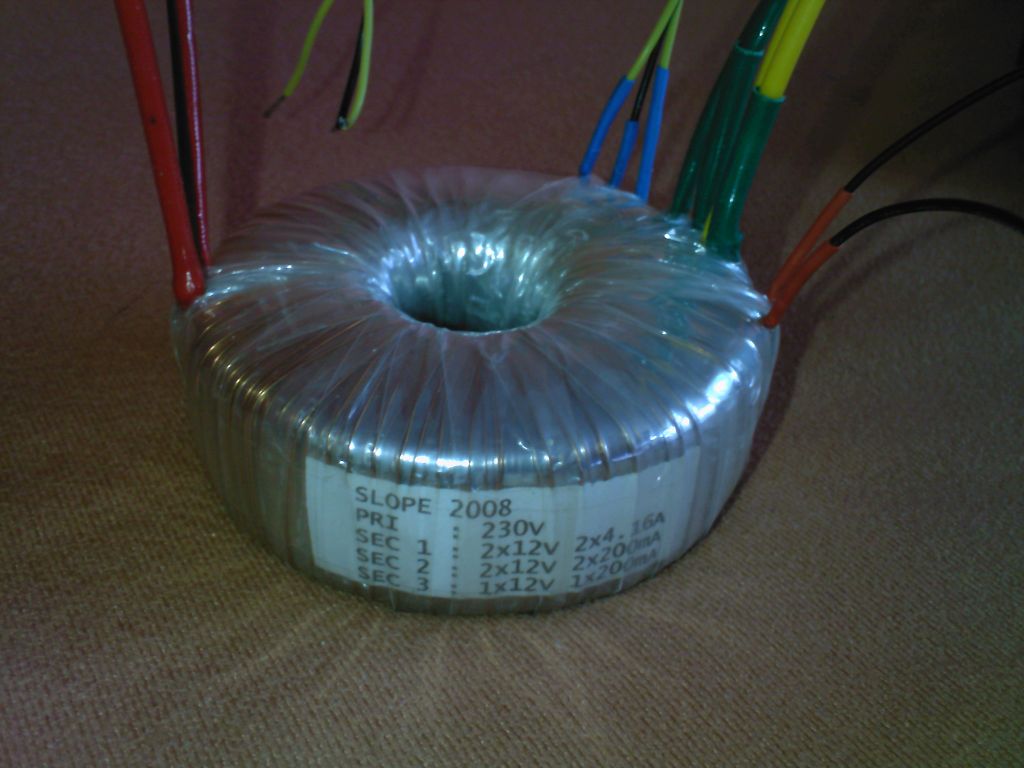A INDEL gyártja, alapból csak a 2x12V, 2x4.16A tekercsek voltak rajta (no meg a primer). Tettem rá még egy középleágazásos 24V-os tekercset, és egy szimpla 12V-os tekercset. A van itthon egy guriga transzformátor szigetelő, több féle is. Amivel szigeteltem az egy celofántszerű anyag, gyárilag is ezzel volt szigetelve (nem tudom mi a neve pontosan). Miután szorosan feltekertem, szépen rámelegítettem, mert a fólia hőre zsugorodik. Van még a szokásos, szövet alapú, és két guriga szilikon szerű szalagom is.