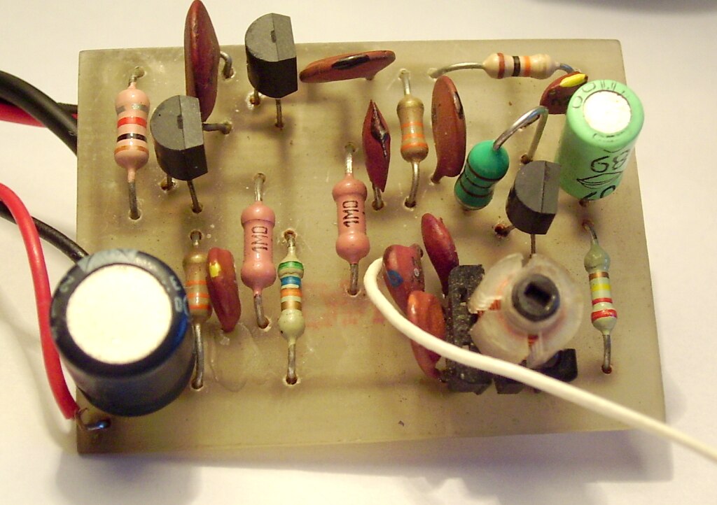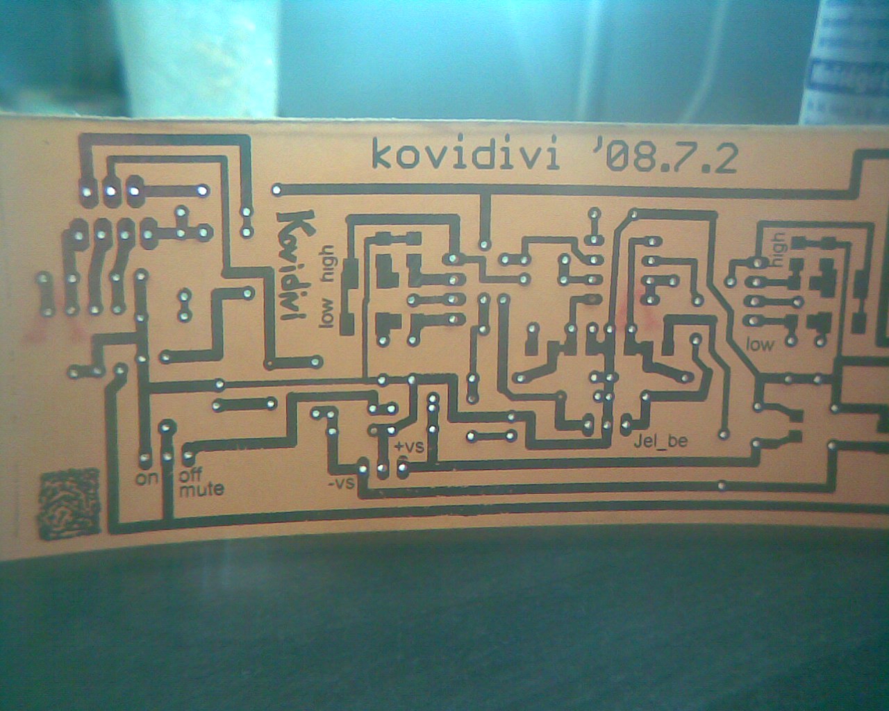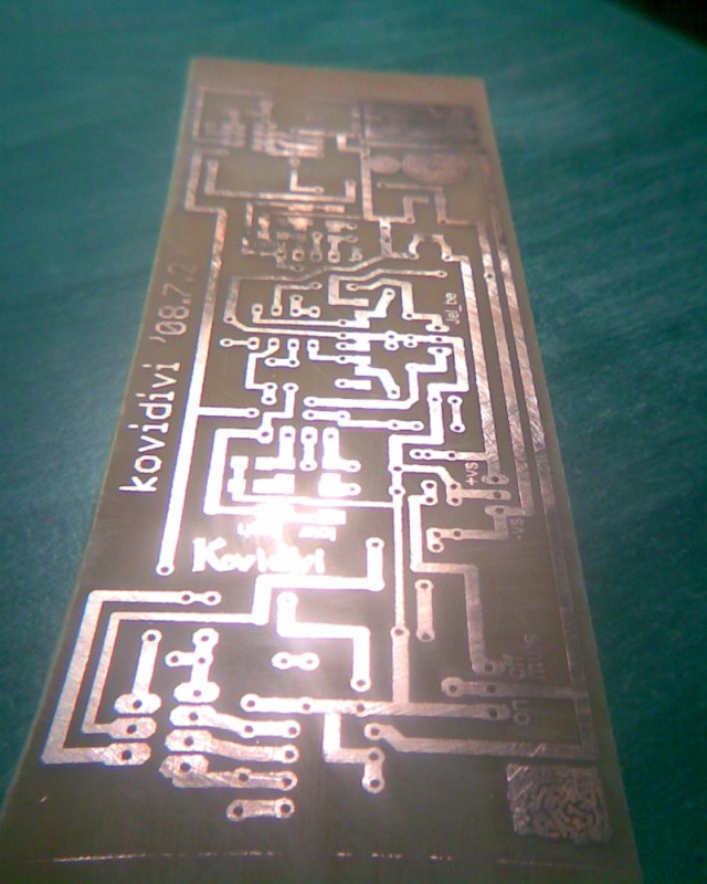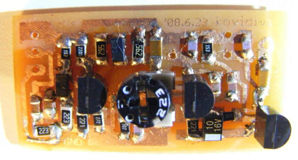 Igazából ezt több, mint 15 éve építettem, de most került a kezembe, működésképtelen állapotban, és meggyógyítottam (a fojtó meg két tranyó cseréjével). Ez egy kis rövidhullámú szupreg vevő, nem nagy szám, de működik. A nyák nem túl szép, főleg, hogy a trimmer is rá van forrasztva, de annak idején az volt a fő, hogy működjön. Egyébként a rajzolat szigetelőszalag felhasználásával készült. Keskeny sávokat vagdaltam belőle a vezetőknek és némileg szélesebbeket a forrszemeknek. Ez volt a legolcsóbb....