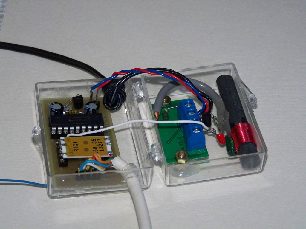 Összeépítetem egy dobozba a korábban már működő RF külső hőmérsékletérzékelőmet egy DCF vevővel. A PIC programját átírva a DCF jeleket is az RF adón küldöm tovább, amit így már több egységgel (mi mással, mint órával