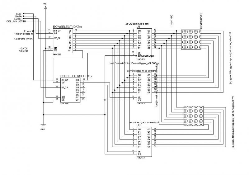 tehát van egy 595 ami kiadja az adatot egy buszmeghajtónak ami tartja a feszkót a kapott SORON. van egy második 595 ami kiválasztja majd az oszlopokat. első 8 bit: sor választás, további 8 btek: oszlop választás. tehát ez az elmélet. mi a véleményetek róla? tehát a cél: LPT portról (ami majd USB FTDI UM245 el lesz helyettesítve) vezérelni LED mátrixot PIC nélkül. Köszi ui: találtam egy ilyet. ilyesmit szeretnék, csak itt egy 595 lenne sorválasztásra felhasznáélva, a többi pedig az oszlopokat vezérelné, és nem 7 bitet adna ki hanem 8 at.