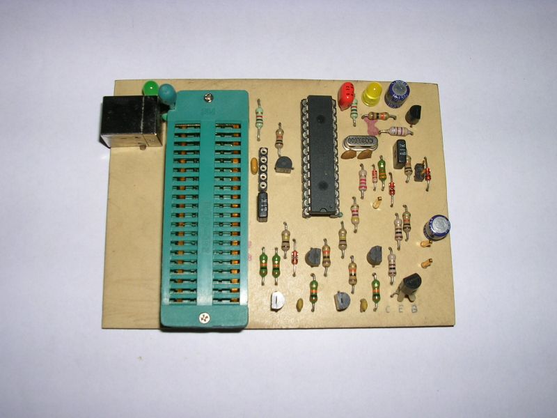 Én is ilyet használok, de a fullos változatát. A kapcsolással volt egy kis gond, de azóta sem raktam vissza az eredeti tranyót (kép jobb alján látható "kókányolásról" van szó). Tökéletesen működik, de ritkán használom, mert nem vagyok még profi a PIC-ek terén. Dobozolást sem kapott, a Textool foglalat miatt nehezen lehetne kivitelezni.