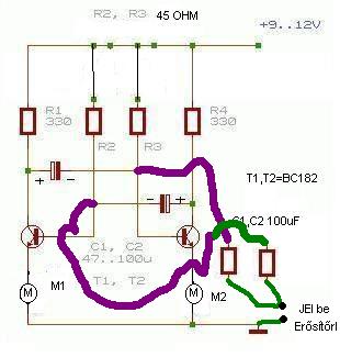Mintát nem lehet rendelni!Megycsinálatam egy kapcsoálst olyan minta anygoknaka lézershowom!!!!Ami van a led villogtatása kapcsolási rajz azzal a ledek hejére tettem a motrokat és csak az ellen´ällást kell 9atm9eretezni m9aikra ami sorba fog kerülni a leddel!Vagy tegyetek pe egy poitiT!Jól muxik!!!epítgetős kedvem van!A Kapcsoláshoz ne kell sokminden 2darab BC182 -es tranyó meg egy p´är kondi!Itt nem kell hüteni semmit!A tranyó nekem elbírta!Vaygúgy is megpróbáltam hogy feltranszfolmáltam a motornak at erzősítő kimenetéről a váltóáramot 12Voltra!A transzformáor primerjét úgy méreteztem hogy 2ohm,és osrba kötök vele 1 2Ohmos ellenállást!Ez is jó megoldás az erősítőnek senni baja sem leszz!Bocsi hogy sokatírok!De ezek nagyon jó megoldások!Én kipróbáltam mindet!VAn még kipróbĺat ötlet ezzel kapcsoltaban!Én leteszeteltem 3óraig ment és semmi baja nem lett semminek!