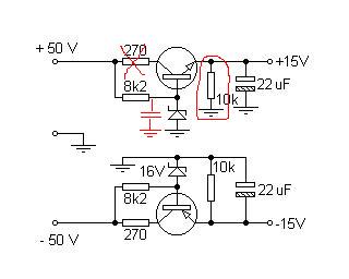 Ezzel a megoldással a végerősítő tápjáról le lehet szedni az előfoknak megfelelő feszt. A zénerek változtatásával lehet állítani a kimenő értékét. A tranyók TIP41, TIP42 vagy valami hasonló pár, nem kritikus. A végfok felőli ellenállások értéke is változhat. Ha külön trafót használsz, inkább LM317, 337 pár, kevésbé zajos, ráadásul állítható.