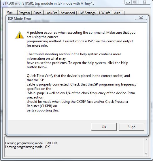 Órajelet levettem legkisebbre is... Lábakat ujra kerestem, hogy jó-e a kapcsolat, de semmi. Kicseréltem az Attiny45-öt, és láss csodát. MŰKŐDIK Rossz, hibás procit kaptam volna? Gyanakszom az antisztatikus zacsik hiányára. SMD-s Attinyi45-öket például celofánba csomagolva kaptam meg Jehujj! Juhéjj! Viszont nem mindig ismeri fel avrstudió a programozót! Áltlában csak akkor, ha bedugom az usb kábelt, és egyből nyomom a connect gombot... Köszönöm!