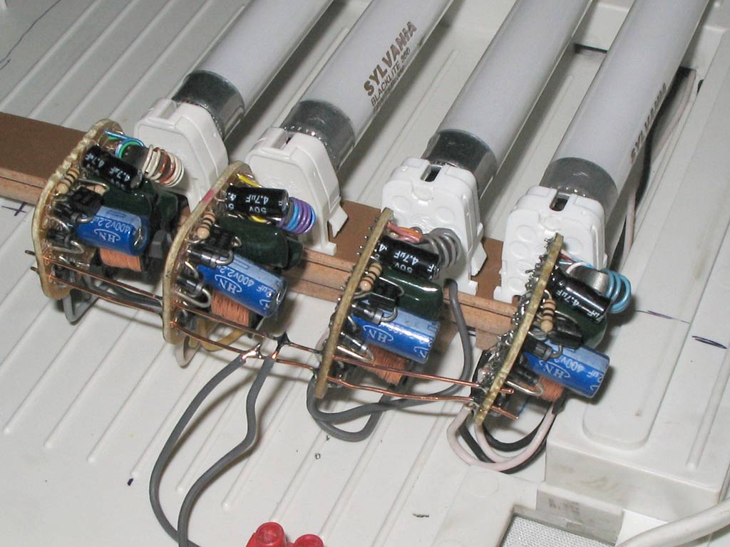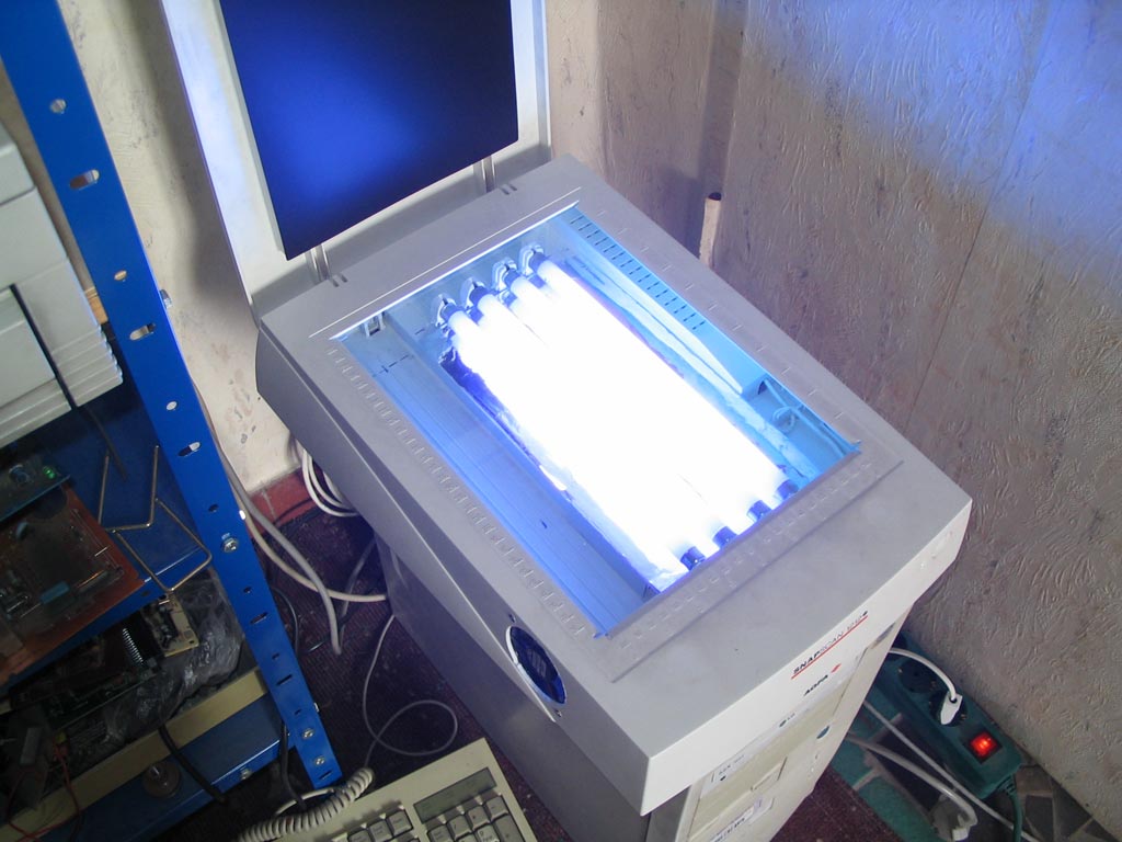Ma befejeztem a levilágítóm bővítését, kapott még két csövet. Így már 4 világít benne. Kompaktfénycső elektronikák hajtják egyenként a csöveket. A négy cső viszont elég szépen melegítette már a dobozt, úgyhogy kapott még egy kis ventillátort is. Érdekes hogy az alufólia szélessége pont akkora mint a csövek hossza, mintha csak nekünk készült volna További érdekesség még a ventillátor fotója: úgy néz ki mintha plexiből lenne a lapátja, pedig sima fekete műanyag. Forgás közben lett lefotózva, és derítésként kapott egy kis vaku villantást. Ezért lett ilyen a kép. A csövek azért vannak ilyen közel, mert 10 - 15 cm széles nyákokat szoktam csinálni max.