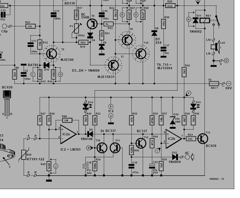 Igy van ez a Majki féle védelem,,a clip led is stimmel,és igen ez az egyik csatornát figyeli,,A led, csak közvetve jelzi ki a teljesítményt, mert akkor fog jelezni, mikor az erősítő kimenőfeszültségének csúcsa 10V-nál jobban megközelíti a tápot. Ez 30V és 40V esetében is kb ,tehát nem a teljesítményt figyeli, hanem a kivezérlés mértékét a táphoz képest. Ha ez neked nem tetszik, akkor ar R15 (27K) értékét módosíthatod. Ha növeled, akkor hamarabb gyúlad ki a Led és fordítva.A clip áramkör a végfok tápjáról üzemel. Az R10-R15/R13 egy feszültségosztót képez, a tápból. Ha az R10 felől érkező bemenőjel az osztásfeszültségnél magasabb, a tranyó lezár és a led világít. Ezért jó szinte minden végfoknál.Mellékelem a clip led elvi kapcsolását ha azt szeretnéd hogy mindkét csatornádat figyelje egyszerüen a rajzon levő -tápról induló clip áramkör mellé egy másik ugyanilyet kell tenni és máris sztereo clip-ed van üdv
