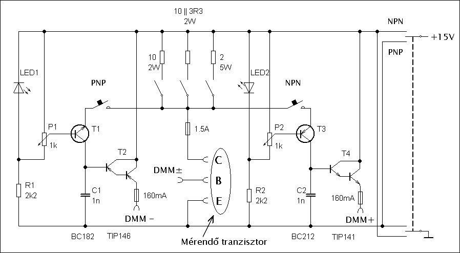 Ha pedig végtranyót akarsz párbaválogatni, ezt nem célszerű multiméterrel, mert azok csak miliampernyi árammal mérik az áramerősítést, az pedig nem igazán jó.. Végtranzisztoroknál 0,2 - 0,5 A-es kollektor árammal célszerű mérni.. Ez a rajz segít összeállítani a méréshez szükséges kapcsolást. A 2k-s ellenállás a bázisáramot jó közelítéssel 2mA-re állítja be. A leolvasott kollektoráramot elosztjuk kettővel, és máris megkaptuk a tranzisztorunk áramerősítési tényezőjét.