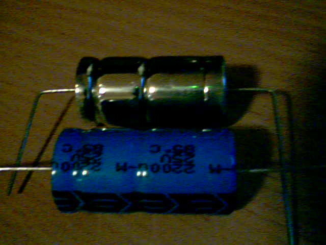 A felirat nem érdekes, mert úgyis tudom milyen értékű, attól hogy levetkőztetem még nem változik a kapacitása nemigaz? A kondi kívül lesz, ugyanis az erősítőnek nem lesz belseje, ez elsőre érdekesen hangozhat, de így lesz, lesz teteje és alja, a tetején lesz a trafó, borda panelek, stb, és az alján futnak majd a kábelek rejtve, ezért is akarom szépre a kondikat is.