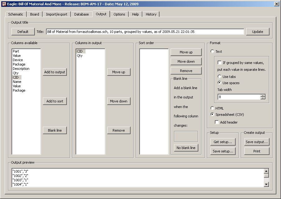 Az Eagle alkatrészekből az ULP csinál listát, de azt nincs energiám most kibogarászni. Ha már a lista kész, akkor a bom-1 képen lehet a CID-t kitölteni. Ha a megnyitott adatbázis tartalmazza, akkor ott szerepel is, ha nem, akkor duplaklikkelés után beírható (a HEStore weblapon történt azonosítás után). Az adatbázis mentése után már másra is használható lesz az alkatrész adata.