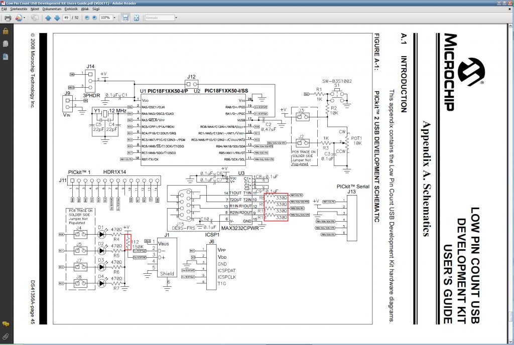 Kipróbáltam a 2.4-es Microchip USB Frameworkben lévő USB Device - CDC - Serial Emulator-t PIC18F14K50-el. Az USB bekötését a PIC18F4550 minimális usb kapcsolási rajzról másoltam. Az átalakító működik, a sebességet átállítottam 57600 bps-re. Viszont megnézve a Low Pin Count USB Development Kit Users Guide-ban a kapcsolási rajzot, látok néhány ellenállást amit én kihagytam. A mellékelt képen pirossal bejelöltem. Ezekre akkor nincs szükség? A szintillesztőm MAX232CPE és csak az RX és TX vonalak vannak bekötve. Jelenleg próbapanelon van összekötve, de ha így jó, akkor bedobozolom.