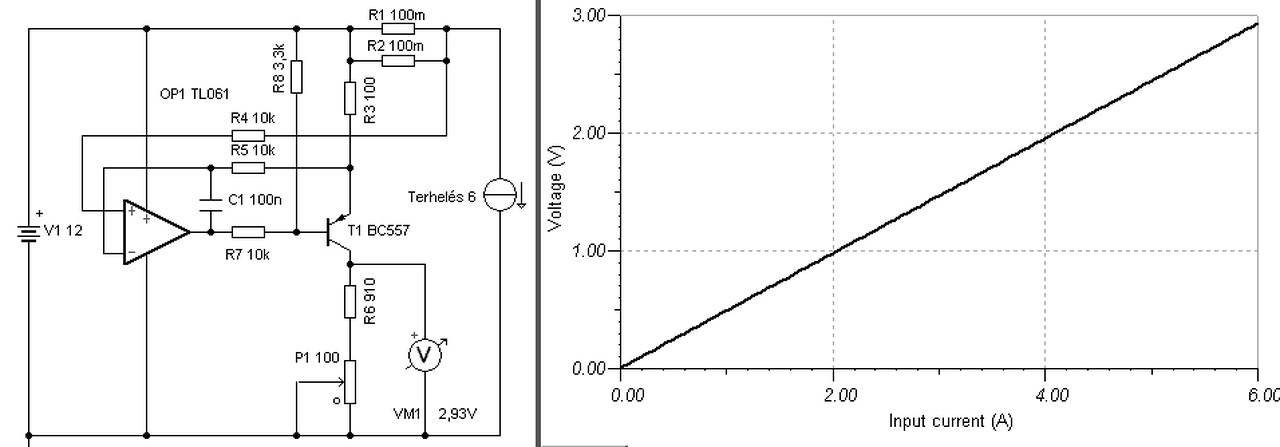 - A PIC 10 bites. Vagy is a referencia feszültségét 1024 bitre bontja. Ha nem akarsz a programban sokat számolgatni (de Te tudod) és az 5V-os tápját használod referenciának, akkor célszerű 10,24A-ig mérni. Vagy is így 6A esetén 600 bit lesz az eredmény. Azzal 10mA-es a felbontás. - Ha 5V a referencia, akkor egy bit feszültsége 5V/1024=4,88mV. 600 bitre pedig 2,929V bementi feszültségnek kell lenni. - Ha a két 0,1 Ohm-ot párhuzamosan kötöd, akkor azon 6A áramnál 300mV esik. Ebből kell a PIC bemenetére 2,93v feszültséget gyártani. - Az áramkör, egy feszültségvezérelt áramgenerátor. A Shunt-ön eső feszültséget beállítja az R3 ellenálláson. Így azon 0,3V/100ohm=3mA áram folyik át. Ez az áram folyik a R6+P1 tagon is. Ennek értékét úgy kell beállítani, hogy 2,93V legyen az eredmény. Természetesen a potival, a Shunt és egyéb ellenállások pontatlanságát is korrigálni lehet.