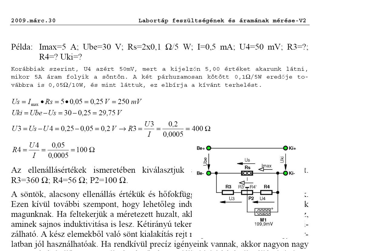 Így már oda-vissza felé számolható a dolog.. Ha pld. ha a Shunt értéke 50mohm az áram 10A és ebből 5V feszültséget szeretnénk elérni, akkor, - Us=I*Rs=10A*50moh=0,5V. - Us=UR3=0,5V IR3=UR3/R3=0,5V/100ohm=5mA - (R6+P1)=Uki/IR3=5V/5mA=1kohm - Az R6 és P1 értékét a kívánt beállítási tartomány szerint választjuk meg. pld. ha ez kb. 10%, akkor R6-nak 910ohm-ot, P1-nek 220ohm-ot választhatunk. - Mivel UR3+U(R6+P1)=0,5V+5V=5,5V. V1 bementi tápfesz nem lehetne elvben kisebb, mint 6V. (Tranyónak is szüksége van némi kollektor-emitter feszültség különbségre. A 3,3V tápfesz alatt mit értesz? Mert ha a V1 feszültségét és a kívánt áramarányos feszültség 0..3,3V, akkor azt nyilván nem lehet megvalósítani így. Ezekkel az eszközökkel, meg pláne. Akkor más utat (kapcsolást - eszközöket) kell keresni. A hozzászólás módosítva: Szept 8, 2014