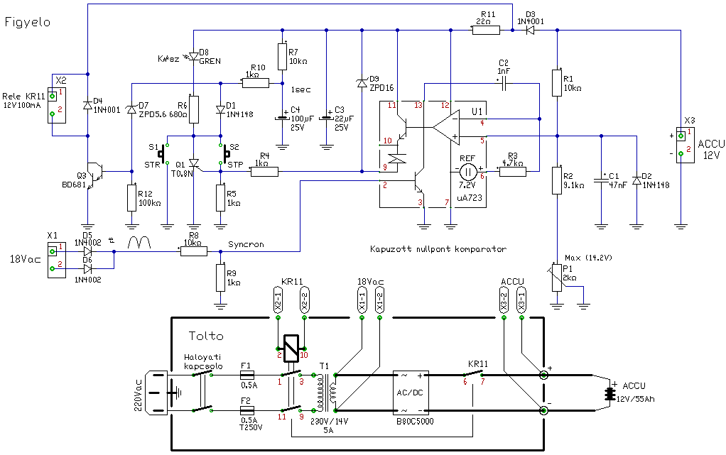 Sajnos, ha egy hiba valamibe bekerül, onnan kiirtani, szinte lehetetlen. A KR11-es relé 6/7 érintkezője, a "töltőn belül" van. Tehát nem a kimeneti sorkapocs és az aksi között, hanem az egyenirányító híd és a kimeneti sorkapocs között. Jelentősége, hogy így az aksi feszültségét közvetlen érzékeli az áramkörünk, és ha rendben van, bekapcsolja a töltőt. Mert sajna így az életbe nem működteti. üdv! proli007