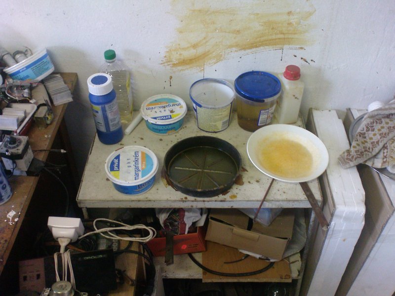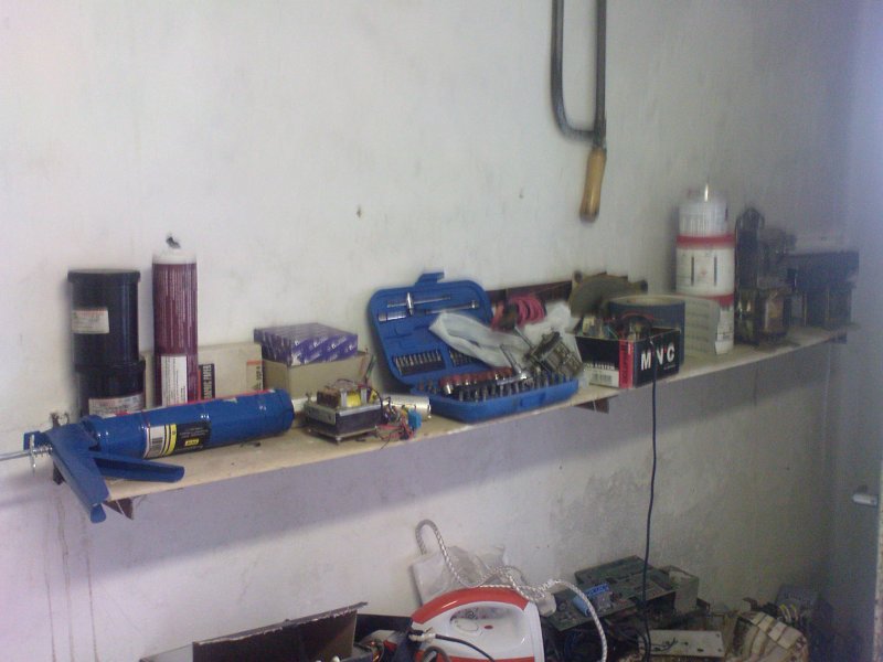 Üdv! Eljött az idő, hogy én is megmutassam az én műhelyemet. Ez az állapot csak ideiglenes, pár héten belül újból teljes kupi lesz belőle. Viszont mostmár meg kellene próbálni rendet tartani. nem egy nagy szám, de nekem tökéletesen megfelel. Nem túl nagy, nem túl szép, de az enyém.A polc a falon saját szerzemény, három tartón van egy gipszkarton lap. Elég stabil lett. A maratórészleg is felismerhető a véletlenül a falra öntött vaskloridtól. Kicsit kapkodtam és beleejtettem a nyákot, így kifröccsent egy pár csepp és sikeresen elkentem a falon. majd le lesz festve szépen és teszek valamit a falra védelem gyanánt.