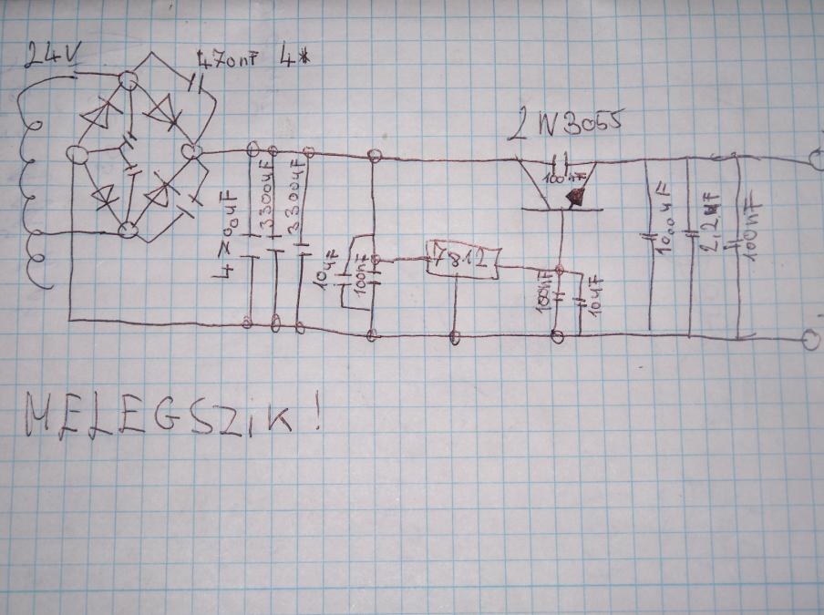 Készítettem egy tápegységet, megszűrve, pufferkondikkal 2N3055-ös tranyóval, 7812-es IC vel. De az egyenirányító melegszik, de nagyon! Szerintem még mindig gerjed de nem tudom, hogy miért... Kapcs rajz mellékelve.