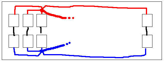 Szóval elöl sorba a 2 akku, hátrajön 2 kábelen a többihez, mindkét Pólus hátul lesz, 3 pár akku közel kis impedancián, meg egy pár elöl "nagyobb" impedancián (kisebb keresztmetszet is elég neki, mert nem az összes áram folyik rajta).