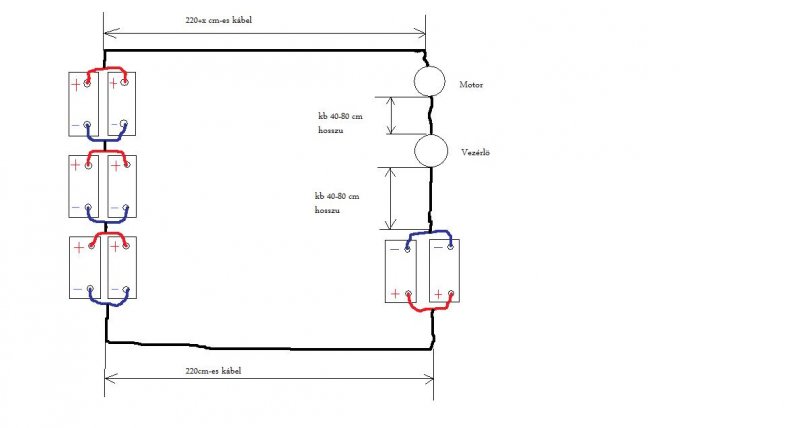 Egy kicsit én is mórickáztam.Ez nagyábol igy lessz bekötve.Az tény hogy a hátulrol jövö egyik kábel az elöl lévö aksikba fog menni.Csak azt nem tudom hogy a másik kábelnek mi legyen a polaritása?Hátul lévö pozitiv polus-motor-vezérlö-elöl lévö negativ polus.Vagy Hátul lévö negativ pólus-vezérlö-motor-elöl lévö pozitiv pólus.