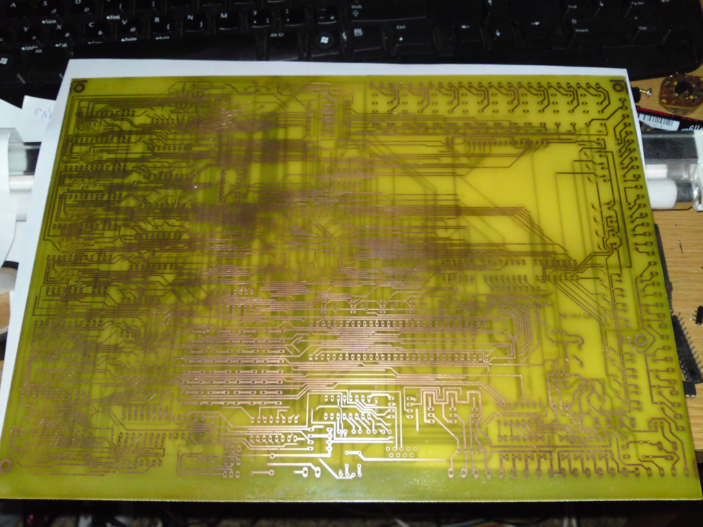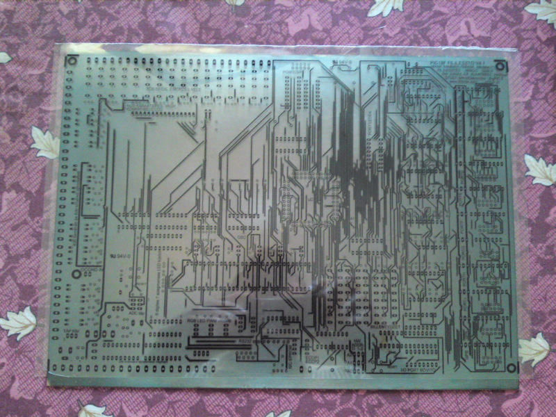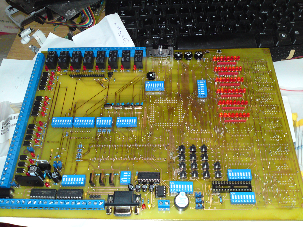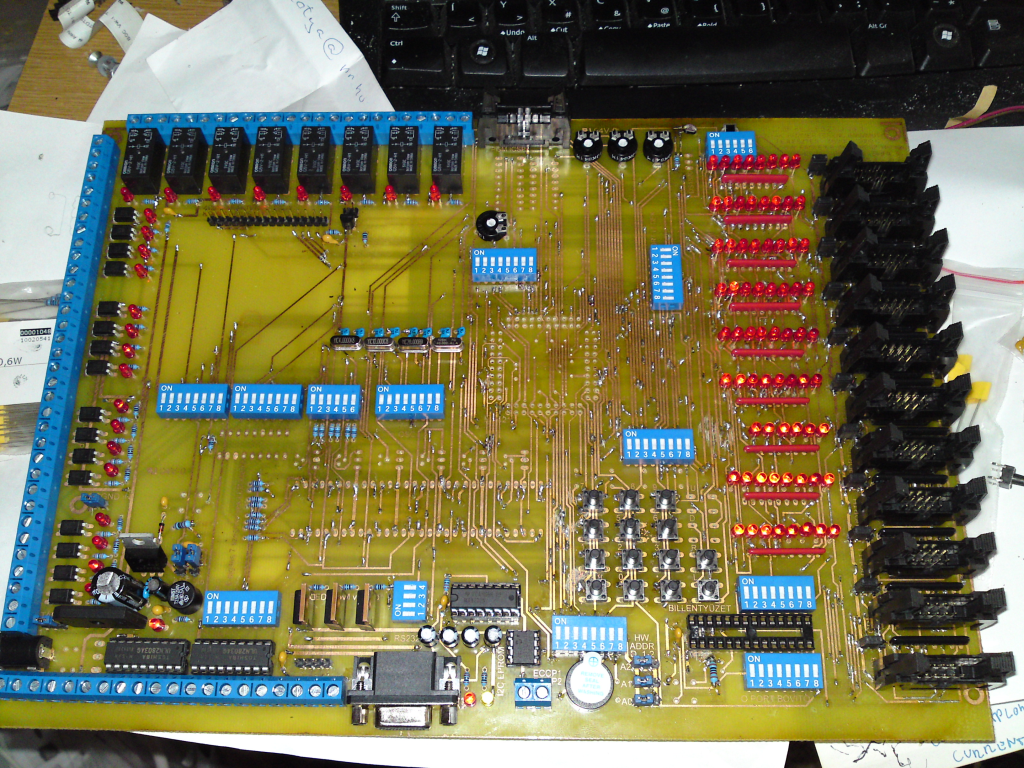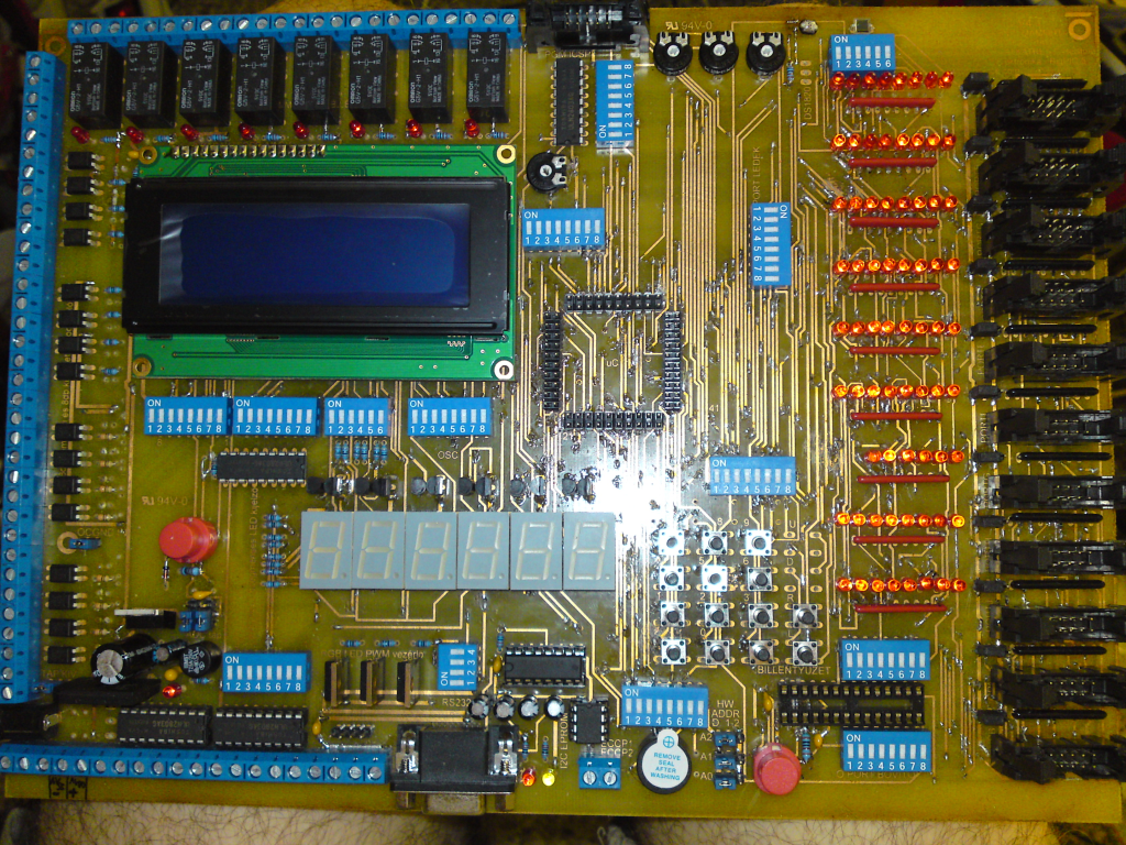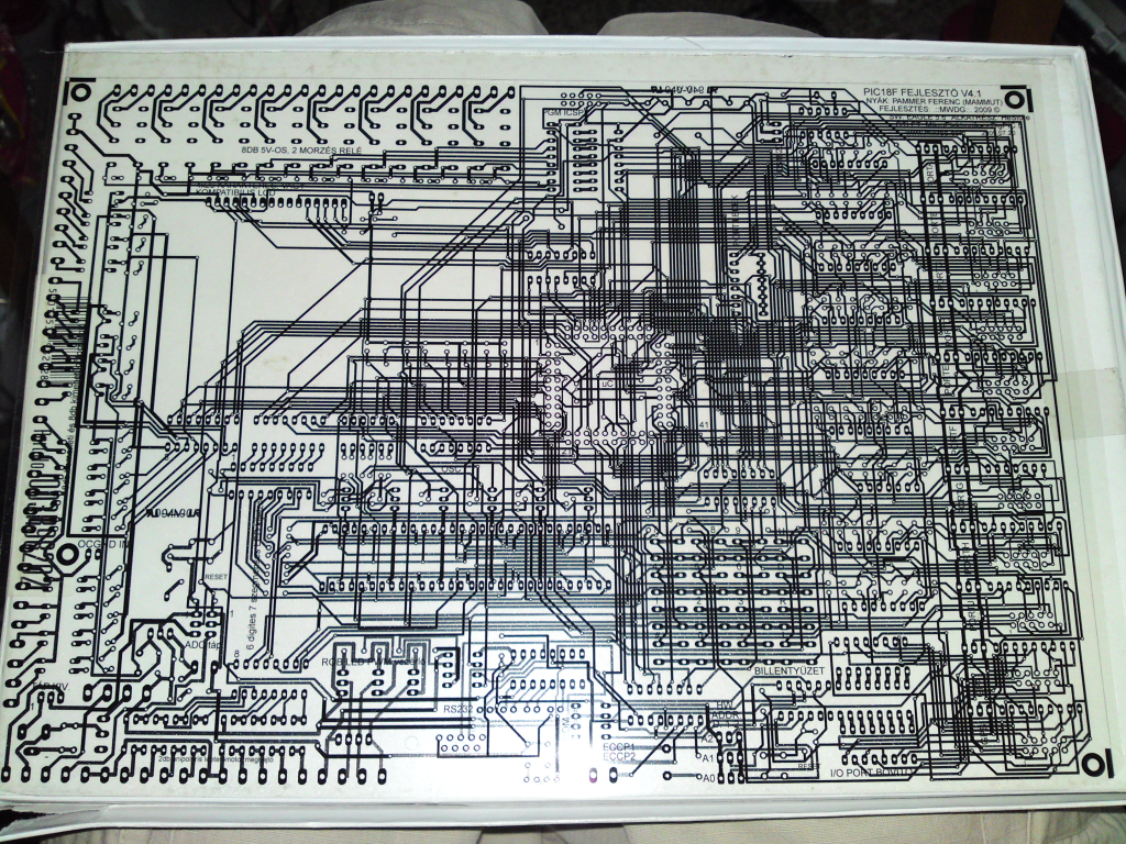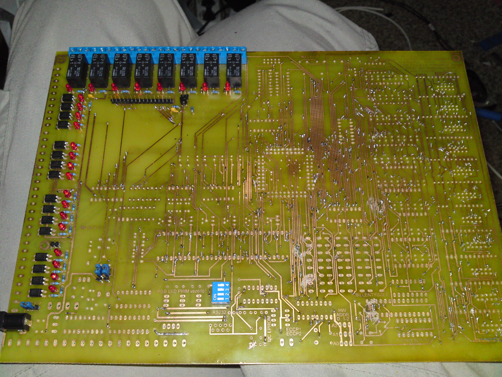1.kép: A teljes panel (pár alkatrész még hiányzik) 2.kép: Anyák szintén forrasztási oldalról nézve. Menetközben tervezési problémák voltak az optocsatolóknál, így a ledeket ki kellett venni, mivel összeakadtak. A panel bármely PIC18 mikrovezérlő futtatására alkalmas és program-hardver kapcsolat tanulására, fejlesztésére szolgál. Specifikációk: -A tápellátás bármely 2.1mm-es DC Jack-kel szerelt adapterrel törnténhet + 5V-os feszültség felett 35V-ig. -Külső és belső ADC táp illesztés. -Reset a uC és portbővítő számára. -Kiválasztható OSC 4, 10, 20, 40MHz frekvenciákból. -3db potméter AD művelethez, fotoellenállás, fotodióda, DS1820 hőmérő. -8db 5V-os relé, 8db bemeneti és 8db kimeneti optocsatoló. -4x20 karakteres kék-fehér LCD, -6digit 7szegmenses LED kijelző mátrixolva (sorok-oszlopok). -4x4-es nyomógomb mátrix, -2db unipoláris léptetőmotor vezérlés tekercsenként 1A terhelhetőséggel. -RGB LED PWM meghajtó kimenet 3db IRF510 FET-tel (igazából bármilyem PWM funkcióra alkalmas). -RS232 kommunikáció. -I2C soros EEPROM (24FC256-I/P). -Buzzer (PES12N40PA jó hangos). -I/O portbővítő 2x8 bit (MCP23S17-E/SP). -PORT bit jelző LED-ek, fel/le-húzó ellenállás a portokon, kilökőkaros 10PIN-es csatlakozók a portokhoz és a programozóhoz, minden periféria mikrokapcsolóval leválasztható külső perifériák rácsatlakoztatása miatt. Hát röviden ennyi. Még van pár munkálat a cuccon, de hamarosan végleg kész lesz. (Kis előzetes a következő projectből, ami már megkezdődött: 48x64xRG mátrix kijelző összeszerelés, megjött 50db ami nagyon olcsó volt (8175Ft) az itthoni árakhoz képest. A kijelzőmodult 1-egyetlen Attiny2313 vagy más uC fogja hajtani SHIFT regiszterekkel.... Egy biztos nem lesz mulatság összeforrasztgatni, 54db 74HC595, 432 smd tranyó, 480 ellenállás, meg a sok csatlakozó és LED mátrix mindössze 64x256mm-es panelokon...)