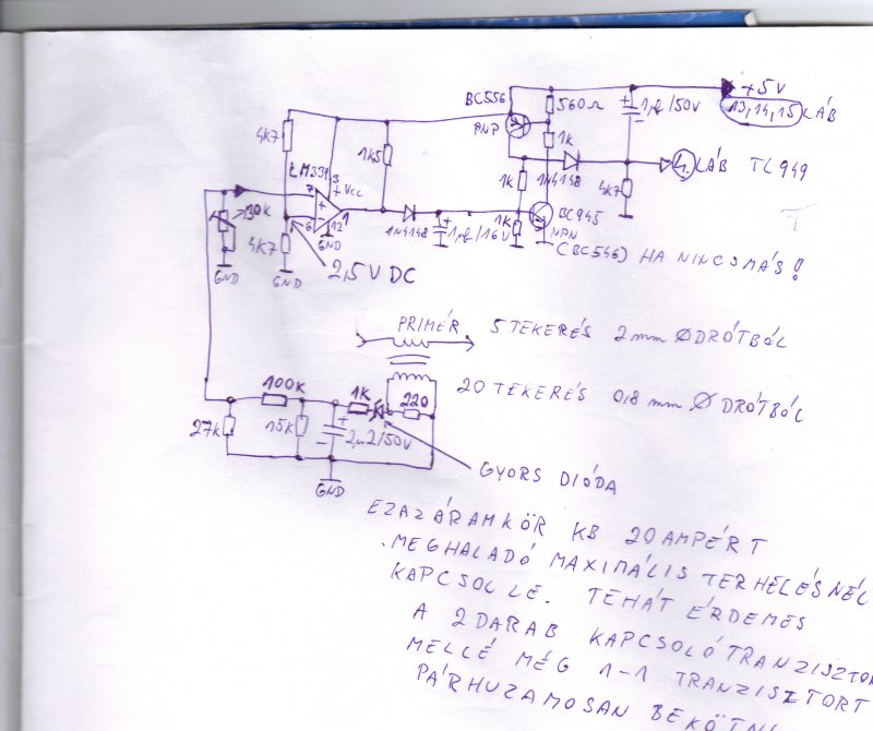 ami 16 ampéros.Gondolom jó sok ampérra lehetett akor képes a táp.Ma reggel rendbehoztam a hibákat és összeraktam az ujabb elméletemet,ez jobban bevált,de csak 1 ohmos ellenálással mertem rövidrezárni.Annál már lekapcsol,viszont 2,5 ohmnál még normálisan megy,ez már elegendö egy nagyobb méretü erösitö ellátására is. |