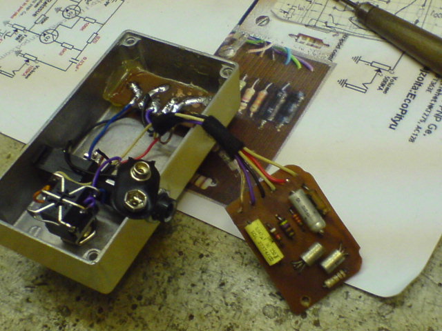 Tegnap összedobtam az enyémet is, de végül nem AC 128-akat tettem bele, hanem valami HITACHI 210-es tranyót, ugyanúgy Ge, és PNP, de jobban néz ki mint az AC 128, abban a tokozásban, amiből nekem sok van, mert ez egy kicsit ducibb... LOMEX M60-as dobozban, jack kapcsolja majd az elemet, kisáramú piros LED-el, fehérre festve...