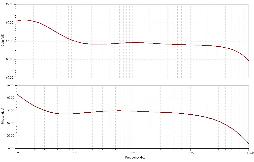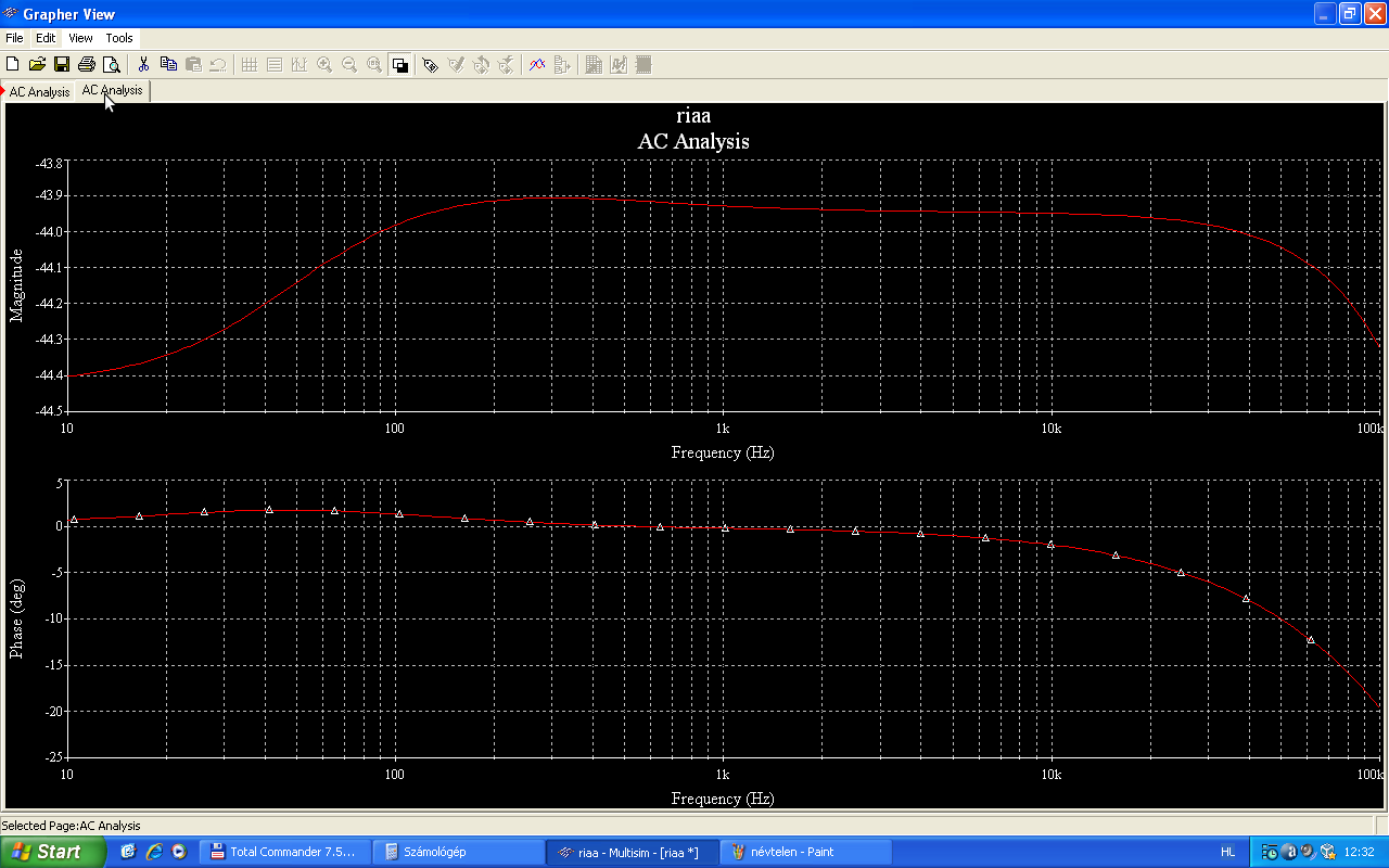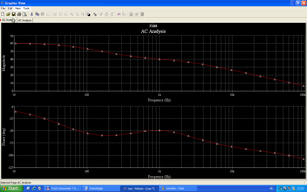 A dolgot kétfelé szedtem, az első fokozattal előerősítés, és a 75us-os töréspont valósul meg, a másodikkal a 318 és 3180us-os töréspontok és további erősítés. Azért választottam invertáló fokozatot, mert itt a végtelenben az erősítés nem fog 1-hez konvergálni egy aluláteresztő jellegű fokozatnál sem. A kapcsolást MS10-ben teszteltem, elég szépen igazodik a korábban közölt anti-RIAA-hoz is, bár nem vagyok róla meggyőződve, hogy az valóban ezeket a töréspontokat tartalmazza. Persze biztos nem a legjobb esetleg más szempontokból így a dolog, de a töréspontoknak mindenképpen a helyükön kell lenniük.