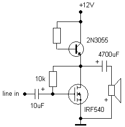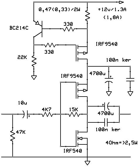 Itt van meg ket kis kapcsolas. 12V-os taplalast igenyelnek es kb 2,5W-ot nyomnak 4Ohmos hangszoroba. A FETeket hutobordara kell szerelni. Az elso amelyen ket FET van, egy auto egon keresztul kapja az aramot (PTC karakterisztika). 1,2-1,5A lenne a kivant nyugalmi arama. Bekapcsolaskor a tapot egyhen "meguti". A 3 FETes kapcsolas hasonlo tulajdonsagokkal van, de az aramgenerator miatt kicsit jobb karakterisztikakkal es nincs bekapcsolaskor "utes". A felso 4700u-os kondi lehet esetleg nagyobb is. Mindket kapcsolas levegoben szerelheto.
