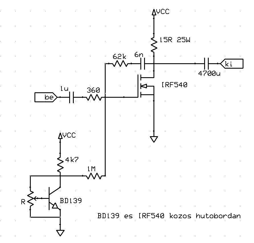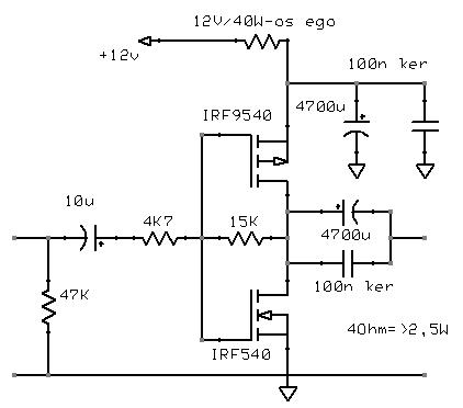 nos,a két fet-es rajzot kapásból elvetettem,mármint a megépítés lehetőségét.A táp nagyon alacsony,1-2W-okért meg nem érdemes vesződni semmivel.szerintem... A három fet-es már valamivel jobban tetszik,és némi hasonlóságot mutat az általam épített kapcsolással,de a tápfesz-t itt is emelni kellene legalább 24V-ra,h méltányolható teljesítmény legyen elérhető.Kérdés:hogyan reagál erre a nyugalmi áram? Talán egyszer összedobom,de jelenleg nincs P"-s fet-em itthon.