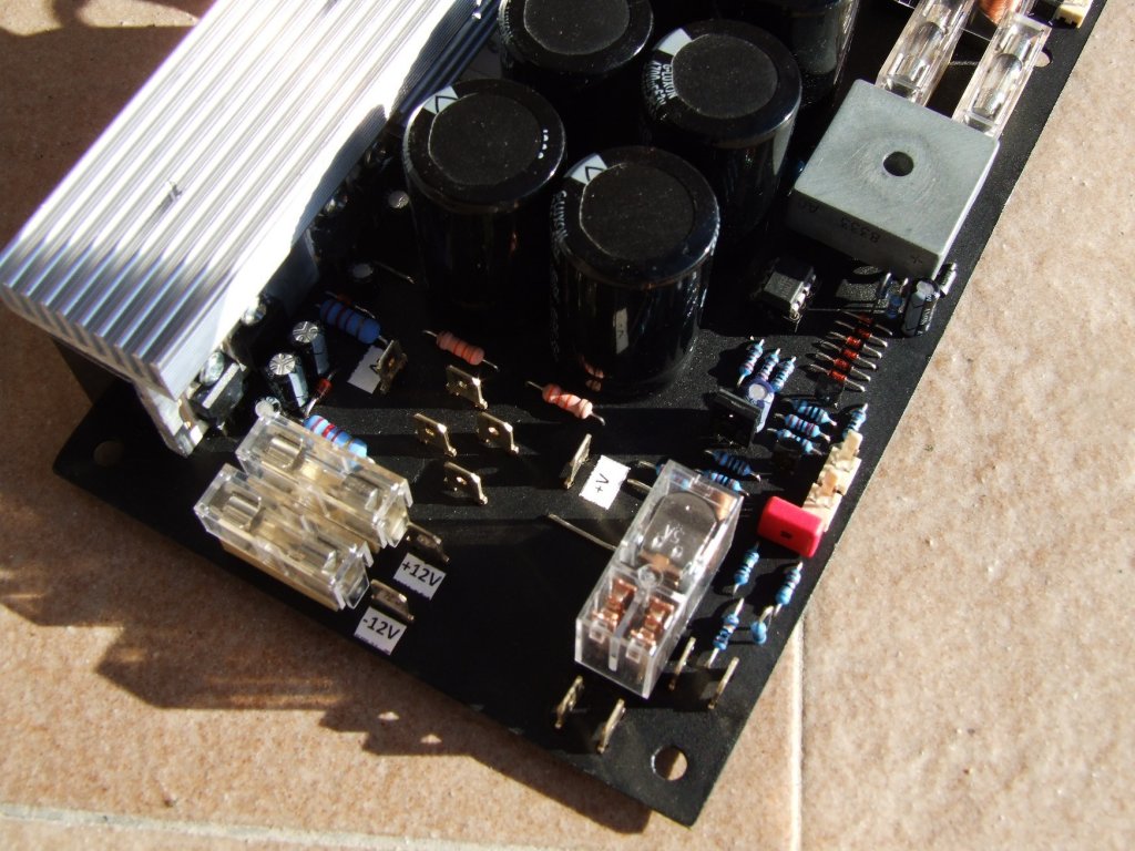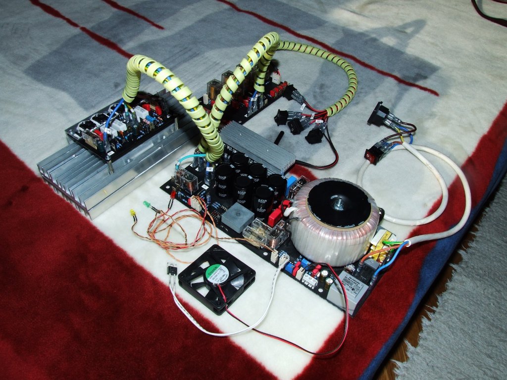 És végül az "all in one tápegység". 200VA toroid, +/-40VDC, 20A diófahíd, csatornánként 3x4700µF + 10µF MKP + 100nF, +/-12V tranzisztoros elszabályzással, saját emi filter a hálózaton, rádiótechnikás egyenfesz védő és koppanásgátló, toroid lágyindító, Attila-féle hővédelem és egy hangfrekvenciára bekapcsoló jászág amivel szenvedtem, hogy megfelelően működjön, az utóbbi két rész a kistrafóról üzemel.