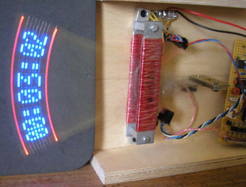 1. részben kérésedre összegyüjtöttem használható információkat. A nyákrugós működő mechanikát talán egy archivum képeivel tudnám bemutatni, hogyan épül fel, hogyan dolgozik. Két fajta verziót épitettem meg. Az első, egyben kilejző-kar-rugó, szerintem életképes megoldás lett. Egy hónapig ment ezzel is a teszt, nem történt rugótörés. Ma is működő a kijelző-kar, átszerelve újabb eszközökbe. A másik verzió szintén nyákrugós, de itt már nem egyben van a karral. Ezt külön tudtam össze illeszteni derékszögben, forrasztva egymáshoz a nyákrugót, ill a kijelzőkart. Ez egy 15mm hosszban (kétoldalas) fólia meghagyásával történt mindkét egységen. Így nagyon könnyű volt felszerelni a mágnest, takaróíveket az optóhoz, vagy Hall IC-nél még a kis vezérlő mágnest is. A kijelző-kar-rugó, egyben, 1mm-es kétoldalas 12mm * 210mm hosszú nyáklemezből készült. Ebböl (a befogó résszel együtt), 65mm a rugóhossz úgy, hogy a 12mm-es résztöl fokozatosan 65mm-ig, 9mm-re csökken a szélessége. Itt meghagyva 20mm hosszban a fólia majd a mágnes rögzitéséhez. Ezt követően 4.5mm-re karcsúsítva a végéig. Itt az él felületre kerültek az SMD LED-ek. Mostmár (8+2 is lehet). Meghajtásához az archivum tartalmaz kapcsolási rajzokat is. (Csak 30-35 fok amplitudóig bíztonságos a lengetés mértéke!) A szinkronizált H-hidas vezérlő tudja igazán jól működtetni. Egyelőre ennyit írok erről, ha van valami nem érthető rész, kérdezz. A következő, (2.) részben majd az acélrugós kilelző/kar/mágnes egységekkel foglalkozom, ill. a levezetésekkel. Szia.