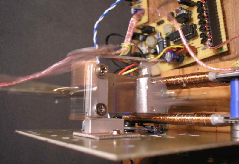 Tovább kisérleteztem az újabb mechanika kialakitásával. Vannak részeredmények egy, már sokat próbált tesztpanelon. Ezt a mechanikát próbáltam úgy kialakitani, hogy a rugólenez középső síkjára essen az összes súlypont a párhuzamos rezgés tartásához. Ezalatt azt értem, hogy a mágnes és a kar is nagyjából ugyanazon sikon helyzkedjen el, így stabil, kiegyensúlyozott mozgása lesz a kijelzőnek. A mágne s síkja az adott, csak a kar szerlvényét kellett agy (kuliszával) megkerülni. Ezen az úton haladva, nagy valószinüséggel megszünnek majd a berezgésre vonatkozó kellemetlen hatások is, hiszen az ellentétes írányú mozgási erők, nagyobbrészt kiolthatják egymást . A kisérletek még folynak, néhány felvételen az összeállítás képeit szemlélhetjük meg. Szia.