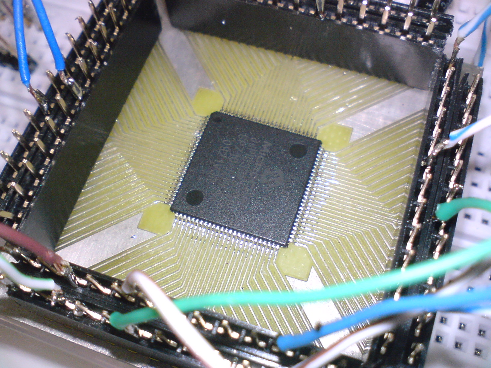 Ha már SMD... egy 100 lábú (TQFP) dsPIC. Egy sima hőmérséklet-szabályzós pákával forrasztottam be, igaz weller volt, de otthon a solomon állomásommal is megcsináltam volna ilyenre (vagy még különbre, mert otthon több hegyem is van).