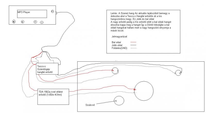 Egy Problémával fordulnék A témában jártas személyekhez. Az lenne a gondom hogy építettem egy Hangfalat amibe a legjobb egy 2.1 erősítő lenne de nekem nem volt hozzá alkatrészem se kapcsolási rajzom hogy ezt meg tudjam oldani, és most egy eléggé tákolt módszerrel van megcsinálva: A Kis hangszórók sztereó-ba a nagy pedig mono-ba van kötve de úgy hogy a Bal oldalhoz, Ehhez rajzolok majd egy vázlatos rajzot hogy el tudd képzelni hogy mi van a dobozba És a Kérésem az hogy egy olyan előerősítőhöz szeretnék kapcsolási rajzot kérni ami a sztereót közösíti egy mélyé és a sztereót pedig inkább a magas tartományba küldi át az erősítőnek. A hangfalba levő erősítők: Egy 500 forintos Tesco-s számítógép hangszóró erősítője és egy TDA1562q Ic-s Autós erősítő. A LEGFONTOSABB HOGY 12V-OS A RENDSZER ÉS NEM HÁLÓZATRÓL MŰKÖDTETETT!!! Egy Képet Küldök a hangfalról is majd.