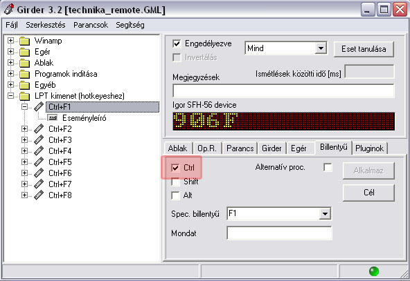 Minimalizálhatod, és lemegy a többi ikon mellé (girder, msn... stb) közben reagál a gyorsbillentyűkre vagy a távirányítóra is Viszont megváltoztattam a gyorsbillentyűket, mert elég sok program használja az F1-et meg pár F-es billkót, szóval Ctrl+F1...Ctrl+F8-ak lettek a gyorsbillentyűk. A girderben pipáljátok még be a Ctrl mezőt!! inpout32.dll