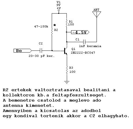 Nah annyit sikerült elérnem már, hogy kb 50m-re növekedett a távolság, de ez még mindig messze van a 200m-től, mert kb. annyi kellene. Aztán hozzáépítettem egy korábbi hozzászólásban említett kis egy tranzisztoros végfokot(melléklet szerintit) annyi különbséggel, hogy a tranzisztor BC546, de így sem nőtt a hatótáv. Senki nem tud segíteni mit kellene változtatnom még? Az adó antennája kb.45 cm, ideális 1,8 m-es lenne, de gondolom azért 45cm-sel is elérhető a 200m.