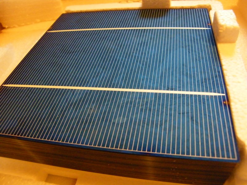 Megjöttek a polikristályos cellák és egy újfajta drót. Picit vékonyabb és keskenyebb mint a korábbi, viszont 1000 szer könnyebb vele dolgozni és gyorsan megy a forrasztás is. Az egyik cellát lepróbáltam egy 500W-os lámpával, kereken 10A-t adott!